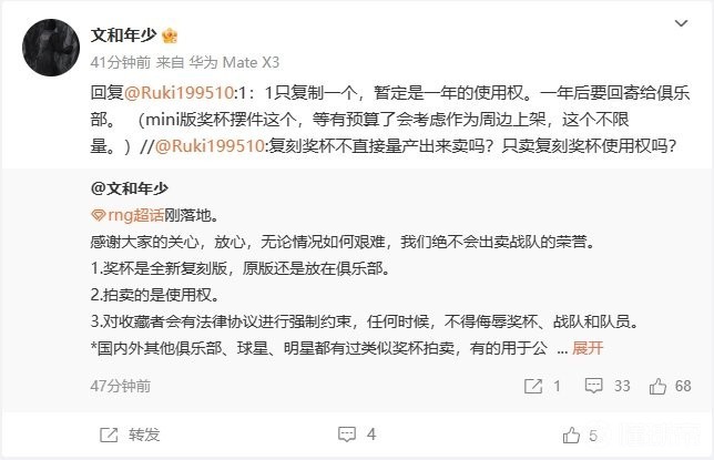 此前RNG俱乐部因严峻财务问题而被推上风口浪尖,RNG俱乐部副总裁早前表示将要售卖RNG的某个冠军奖杯。随后RNG现任CEO回应了关于出售奖杯的事情,他表示绝对不会出卖战队的荣誉,奖杯是全新的复刻版,原版还在俱乐部,而且拍卖的是使用权,对收藏者会有强制约束,任何时候都不能侮辱奖杯,战队以及队员。同时,ceo表态国外的其他俱乐部都有过这样的奖杯拍卖,有的是用以公益,而有的是为了改善自己的经营。
