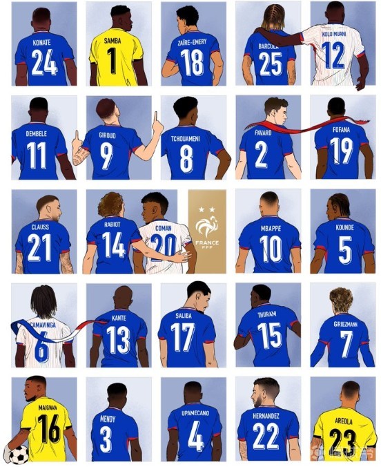 法国队公布了球员在欧洲杯上的球衣号码,其中姆巴佩将身穿10号,格列兹曼7号,吉鲁9号。