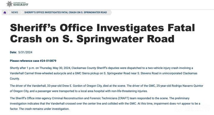 2024年5月30日星期四下午1点刚过,克拉克马斯县警长办公室派出警员赶赴克拉克马斯县Springwater路上处理一起两车相撞事故,事故涉及一辆 Vanderhall Carmel复古三轮车和一辆GMC Sierra皮卡。