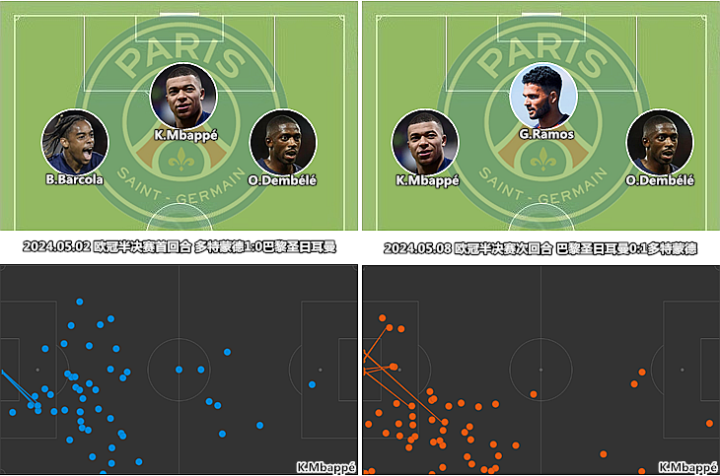 在摩纳哥时期,姆巴佩作为双前锋中活动范围较大的一位,更多地在前场区域持球进攻。加盟巴黎后的第一个赛季,姆巴佩几乎是无缝切换到了右边锋/影锋模式,适应期短到几乎可以忽略不计。