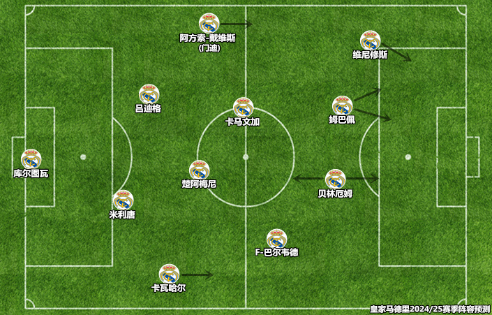 在现有的双前锋+四中场架构里,姆巴佩与维尼修斯可以联手在左路发动进攻,贝林厄姆呼应强侧队友的同时冲击禁区,巴尔韦德与卡瓦哈尔经营右路区域,这种布局唯一的遗憾就是要牺牲罗德里戈。当然,在需要加强进攻的比赛中,安切洛蒂也可以安排四名中前场攻击手同时出场,贝林厄姆回到其熟悉的中前卫位置上。维尼修斯、罗德里戈和巴尔韦德都能积极地参与到边路防守中,贝林厄姆在两个禁区之间驰骋的身影令人印象深刻,姆巴佩无须深度回防,只需要将精力集中到进攻和压迫中即可。