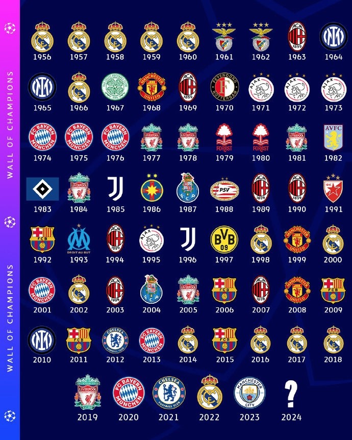 从1955年成立至今,已经有23家不同的俱乐部斩获过这一欧洲足坛的最高荣誉,其中去年的曼城则是最近的新科冠军。