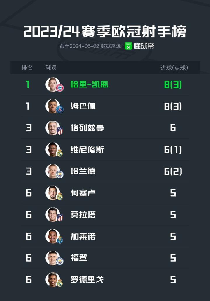 本赛季欧冠射手榜:凯恩、姆巴佩以8粒进球并列第一