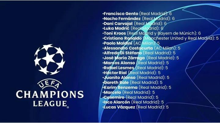 托尼-克罗斯、莫德里奇、纳乔、卡瓦哈尔本场比赛之前5次拿到欧冠冠军,此役过后,他们与俱乐部传奇亨托共享欧冠历史夺冠次数最多球员的纪录。