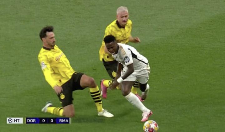 本场比赛第35分钟,维尼修斯铲倒多特门将科贝尔,吃到一张黄牌。第40分钟,维尼修斯拿球在边路面对胡梅尔斯防守时倒地,主裁判判罚胡梅尔斯犯规,随后施洛特贝克向裁判抗议判罚,却吃到了一张黄牌。穆里尼奥说:“这毫无疑问是一次假摔,然后施洛特贝克因为向裁判抱怨吃到了一张黄牌,好吧,这确实是一张应得的黄牌,但归根到底,施洛特贝克知道发生了什么,他完全知道那是一次假摔。”