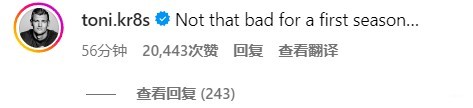 随后,克罗斯在这条动态下评论:“对你的第一个赛季来说,这还不错。”