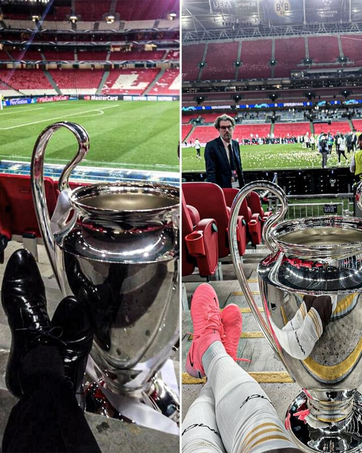 楚阿梅尼因脚部受伤而无法出战本赛季欧冠决赛,在皇马夺冠后,楚阿梅尼在社交媒体发布了一张同样坐在看台上与大耳朵杯的合影,只露出了球鞋,致敬10年前的哈维-阿隆索。