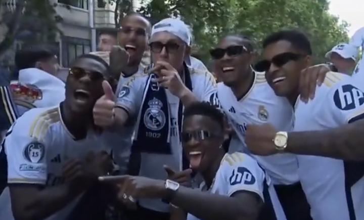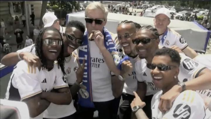 本赛季西甲夺冠之后,安切洛蒂在当时的游行庆典上重现了这一画面,而今天他已经是第三次这样做了。