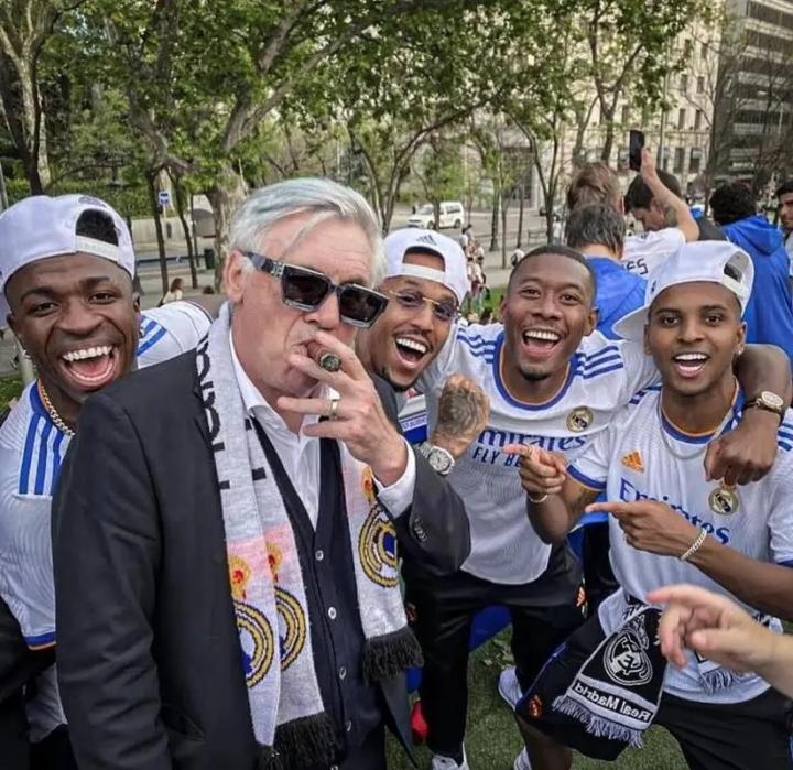 在游行过程当中,皇马主帅安切洛蒂再次重现了他的“世界名画”,他又一次戴起墨镜、拿起雪茄,并与身边的弟子们同框合照。当被俱乐部官方电视台的记者问到此事时,安切洛蒂表示:“这是我们的经典画面,也是我们的经典时刻。我喜欢和我的小伙子们一起搞雪茄的传统。”