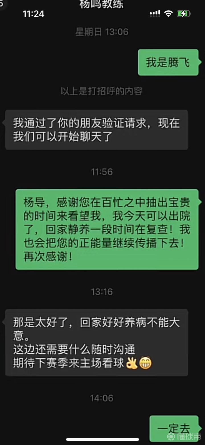 目前这位球迷已经出院,并和杨鸣指导在微信上进行了互动。