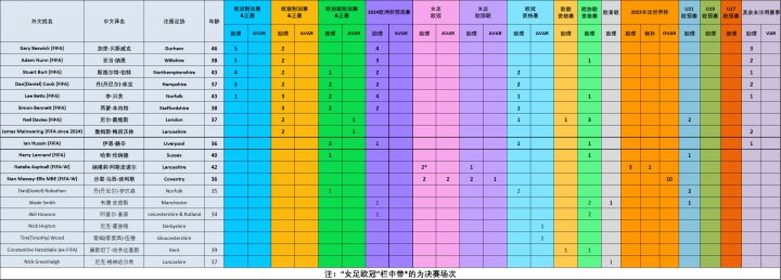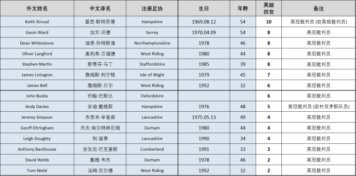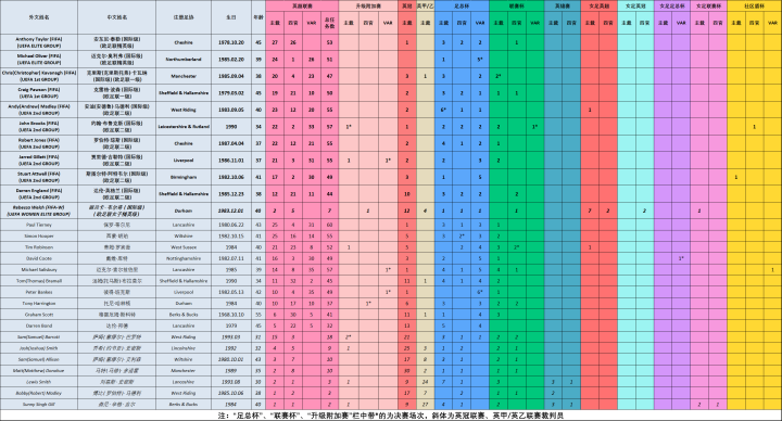 附:23/24赛季执法英超联赛的非国际级裁判员及低级别裁判员执法场次明细