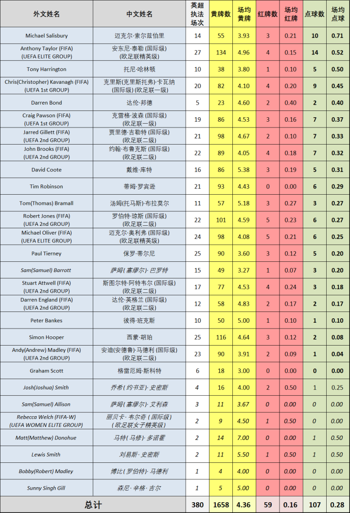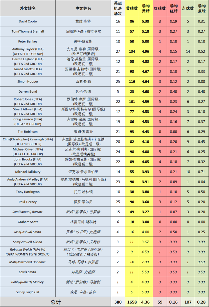 本赛季多名英超裁判员的场均黄牌数都在4至5张的范围内,这在此前也是不常见到的情况,因为过去英超裁判的场均黄牌多为3至4张。