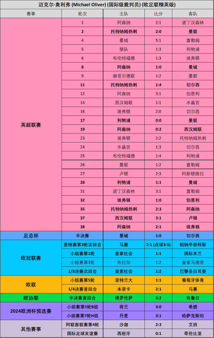 (图)23/24赛季奥利弗各项赛事执法场次明细
