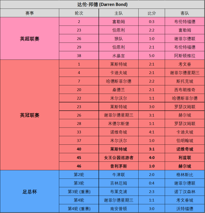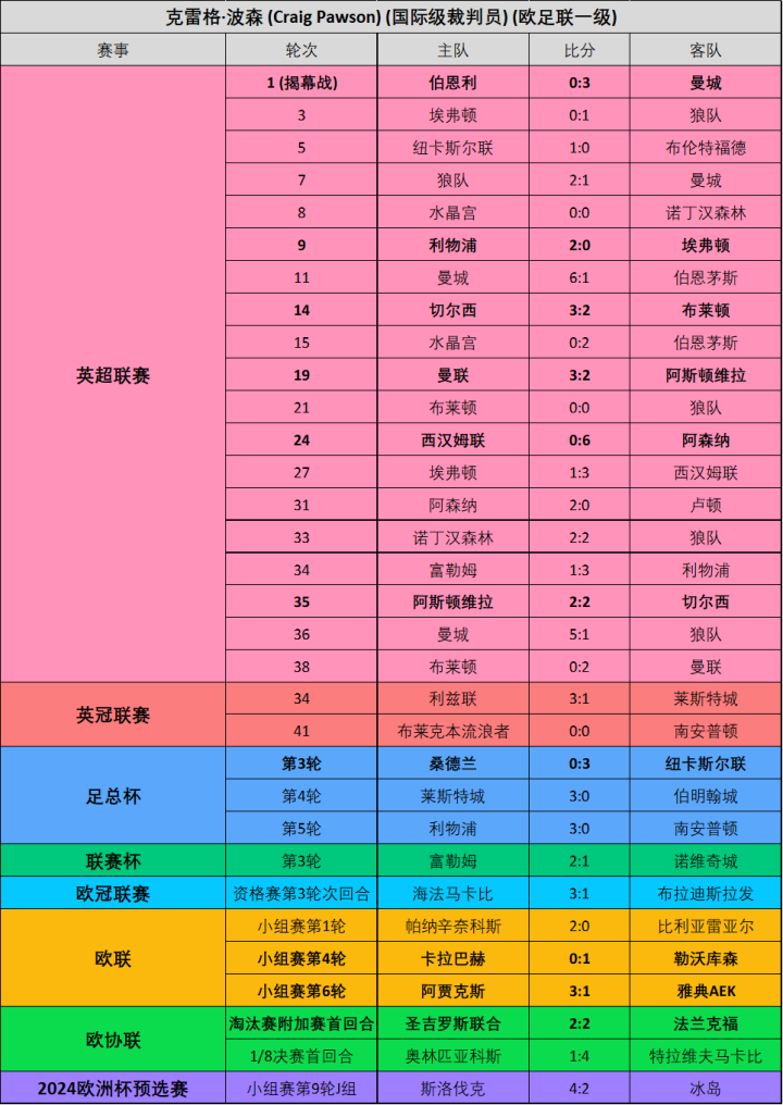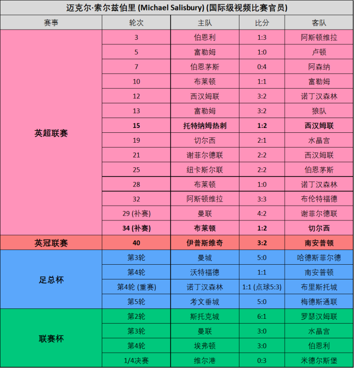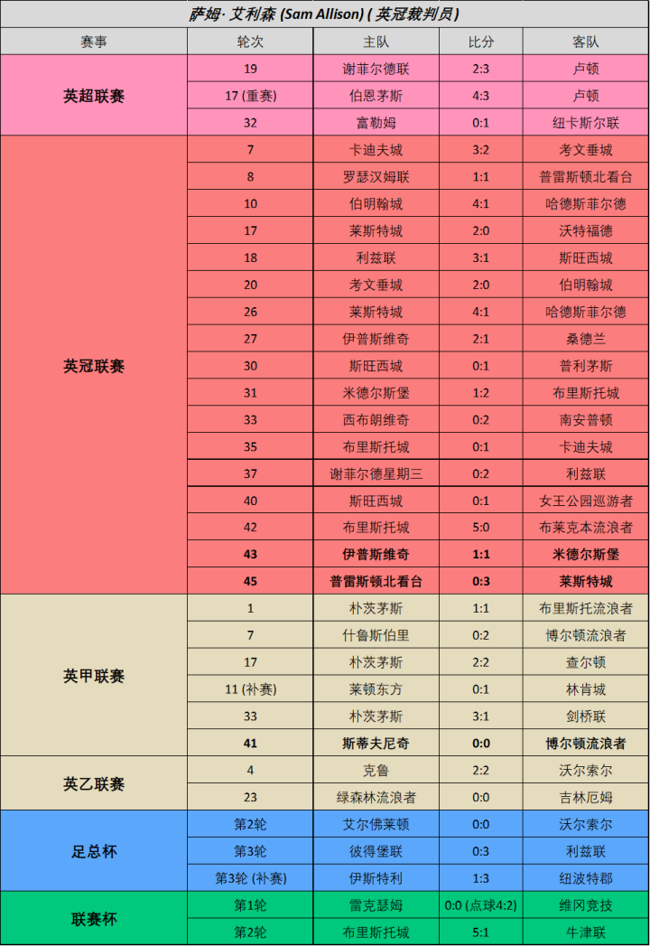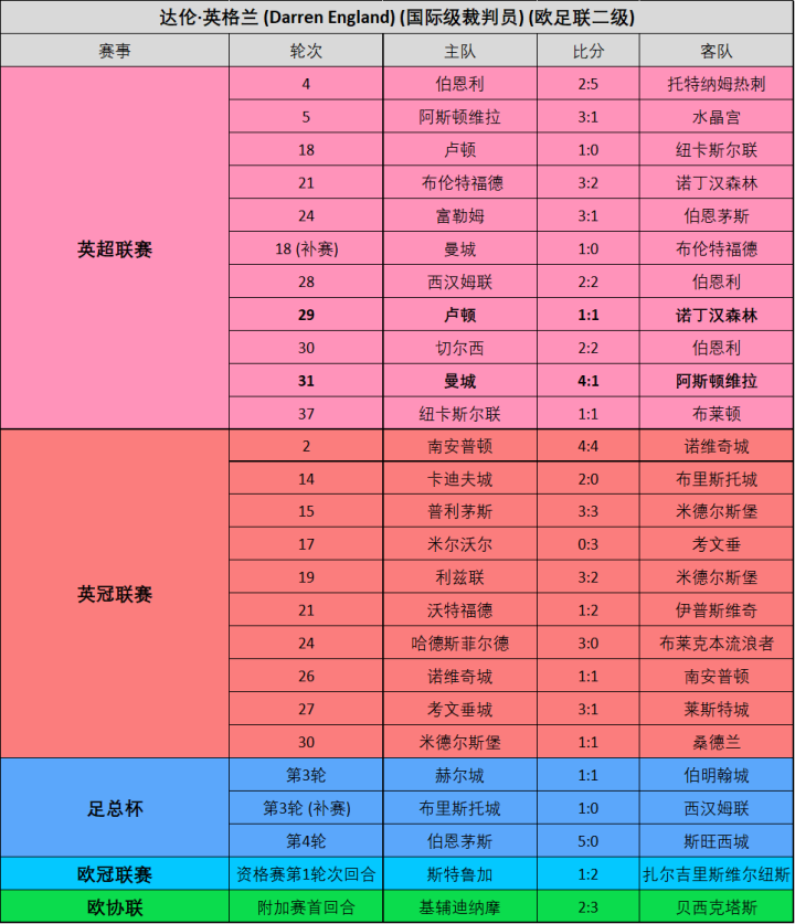 (图)23/24赛季达伦·英格兰各项赛事执法场次明细