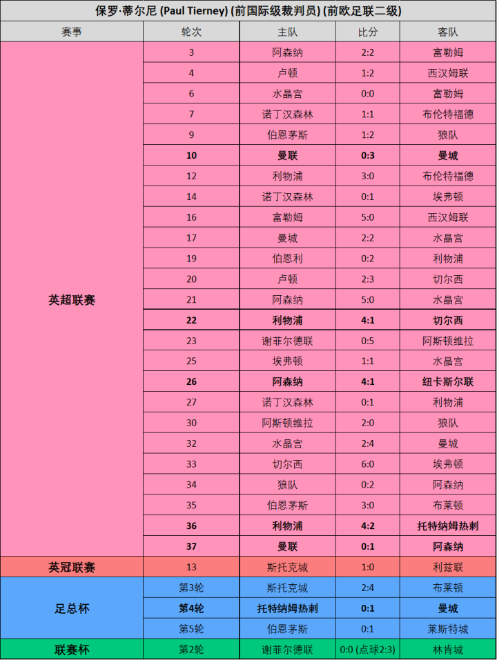 (图)2023/2024赛季英超执法任务场次最多的裁判员——保罗·蒂尔尼