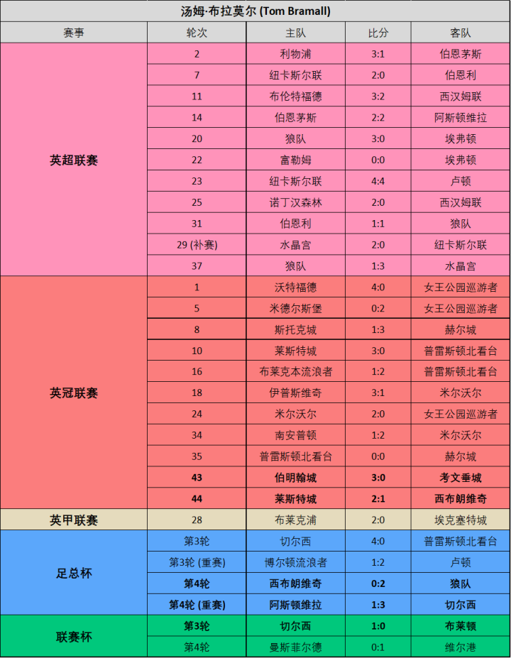 汤姆·布拉莫尔是本赛季担任英超第四官员场次最多的裁判员,共计32场,史上最大龄英超裁判格雷厄姆·斯科特的赛季四官场次也达到了30场。