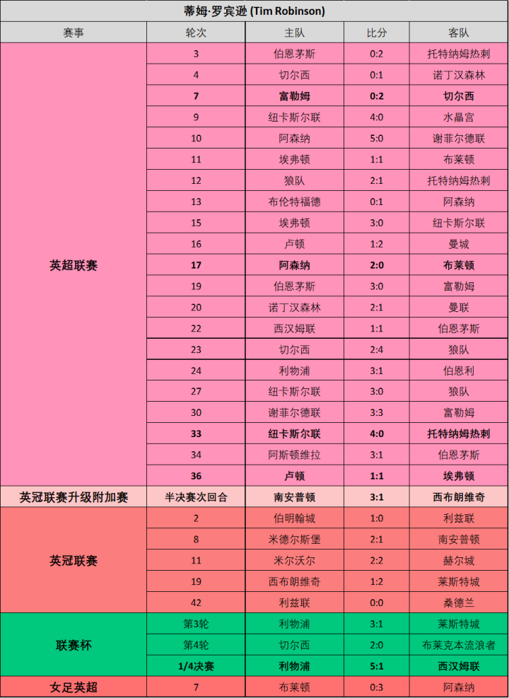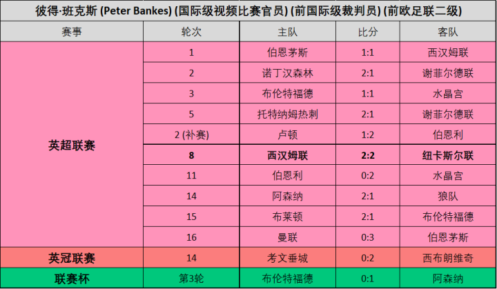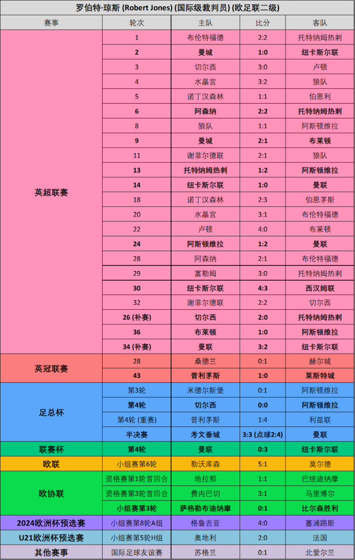 本赛季英超前14轮,琼斯执哨了11场比赛,其中不乏曼城1:0纽卡、阿森纳2:2热刺、热刺1:2维拉、纽卡1:0曼联等多场焦点大战,不过随后他的执法频率有所下降。