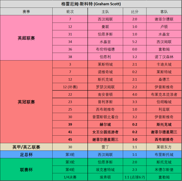 本赛季最后一轮,斯科特回到了摩亚球场,执法了伯恩利1:2诺丁汉森林的比赛,这也很可能成为他英超赛场的谢幕战,这场赛后斯科特职业生涯执法的英超场次数为107场。