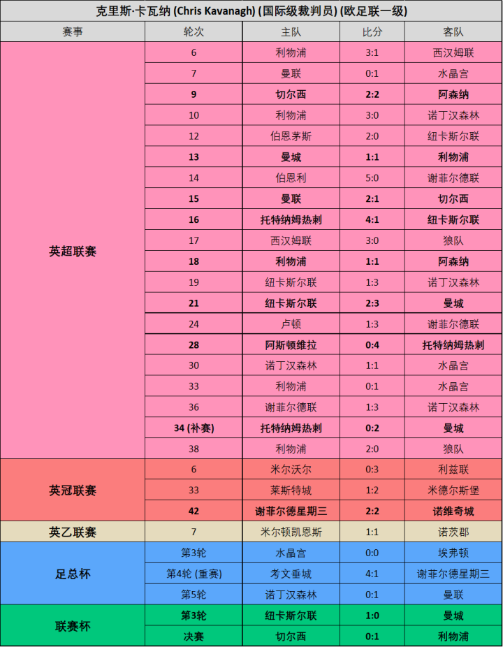 (图)23/24赛季卡瓦纳各项赛事执法场次明细