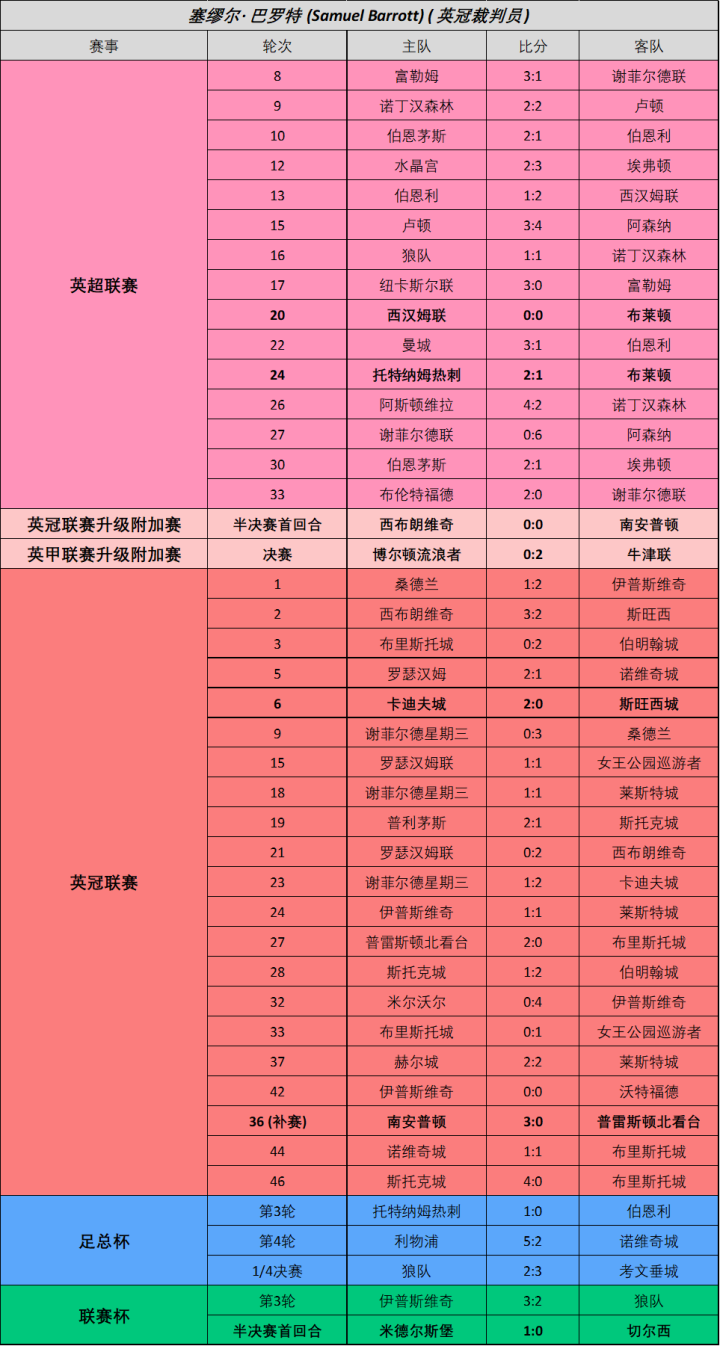 赛季末,巴罗特还先后执法了英冠联赛升级附加赛半决赛首回合较量(西布朗维奇0:0南安普顿)以及英甲联赛升级附加赛决赛(博尔顿流浪者0:2牛津联),足以见得PGMOL对他的信任。如无意外的话,巴罗特将在下赛季正式成为英超裁判员,并有较大希望在短期内晋升国际级。