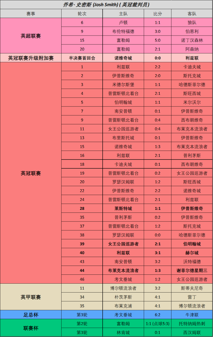 本赛季,32岁的乔希·史密斯共计执法了4场英超联赛,赛季末同样执法了英冠升级附加赛半决赛首回合的比赛(诺维奇0:0利兹联),大概率将和巴罗特一同出现在下赛季英超裁判的名单中。