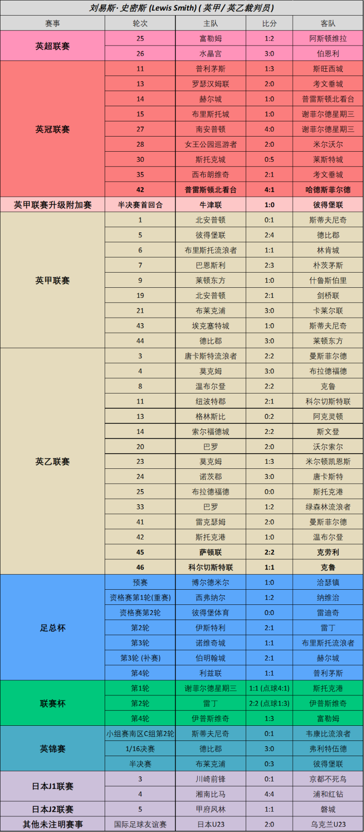 年仅30岁的英甲、英乙裁判员刘易斯·史密斯是本赛季执法过英超联赛的裁判中最为年轻的,他在第25和26轮连续执法了两场英超联赛,实现了“跳级”执法,还在赛季末的英甲升级附加赛半决赛首回合比赛中担任了主裁(牛津联1:0彼得堡联)。