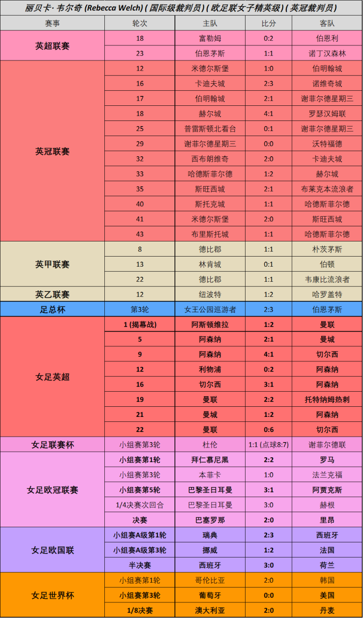 现年40岁的韦尔奇曾在NHS工作,自2015年起成为国际级裁判员,随后在2016/17以及2019/20赛季两度执法女子足总杯决赛,并在2020年执法女子社区盾杯。