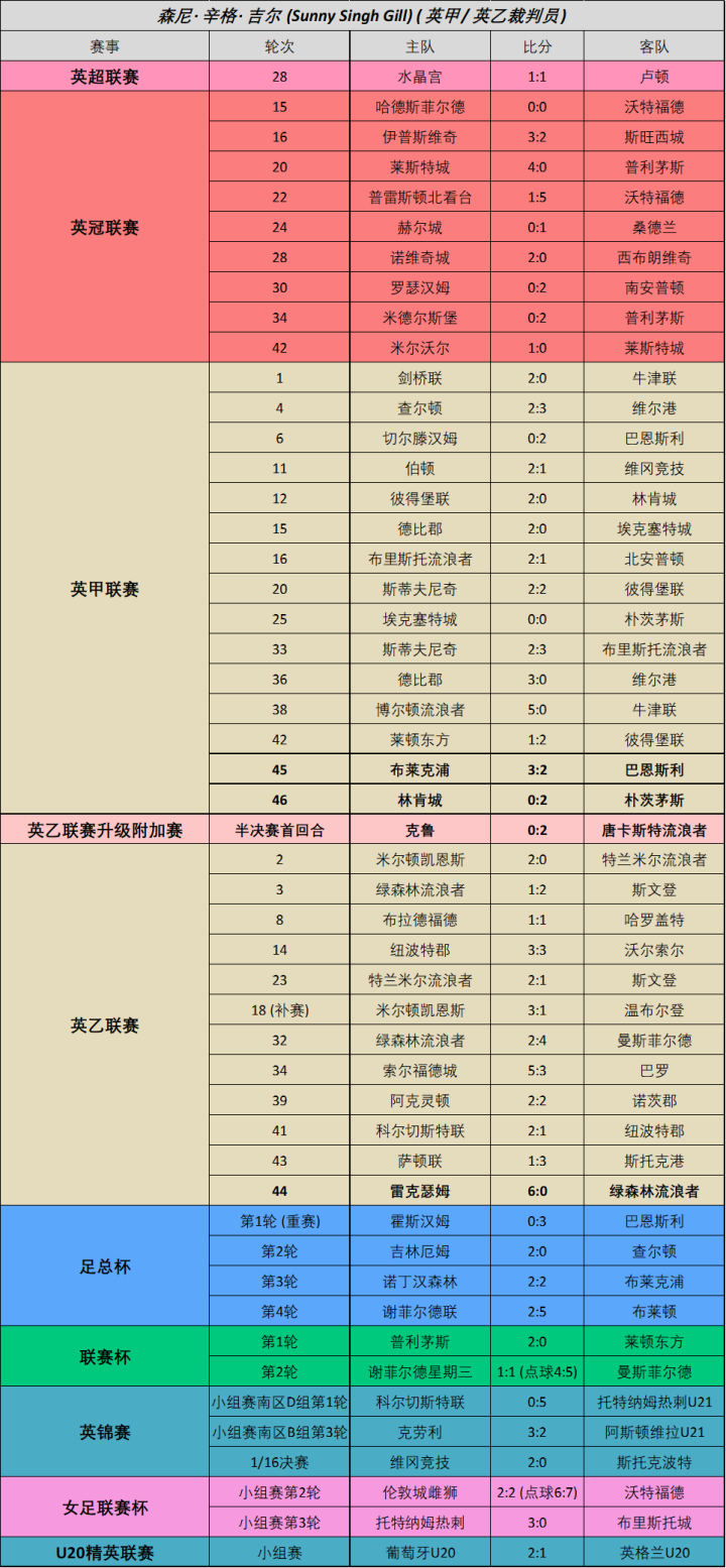 森尼·辛格-吉尔在28轮水晶宫1:1卢顿的比赛中完成了英超联赛的执哨首秀,成为了英超史上首位担任主裁的锡克教旁遮普人。不过,这场比赛过后,辛格-吉尔并未得到更多的英超执哨机会,赛季末执法了在英乙升级附加赛半决赛首回合较量,下赛季大概率也能够晋升为英冠裁判员。