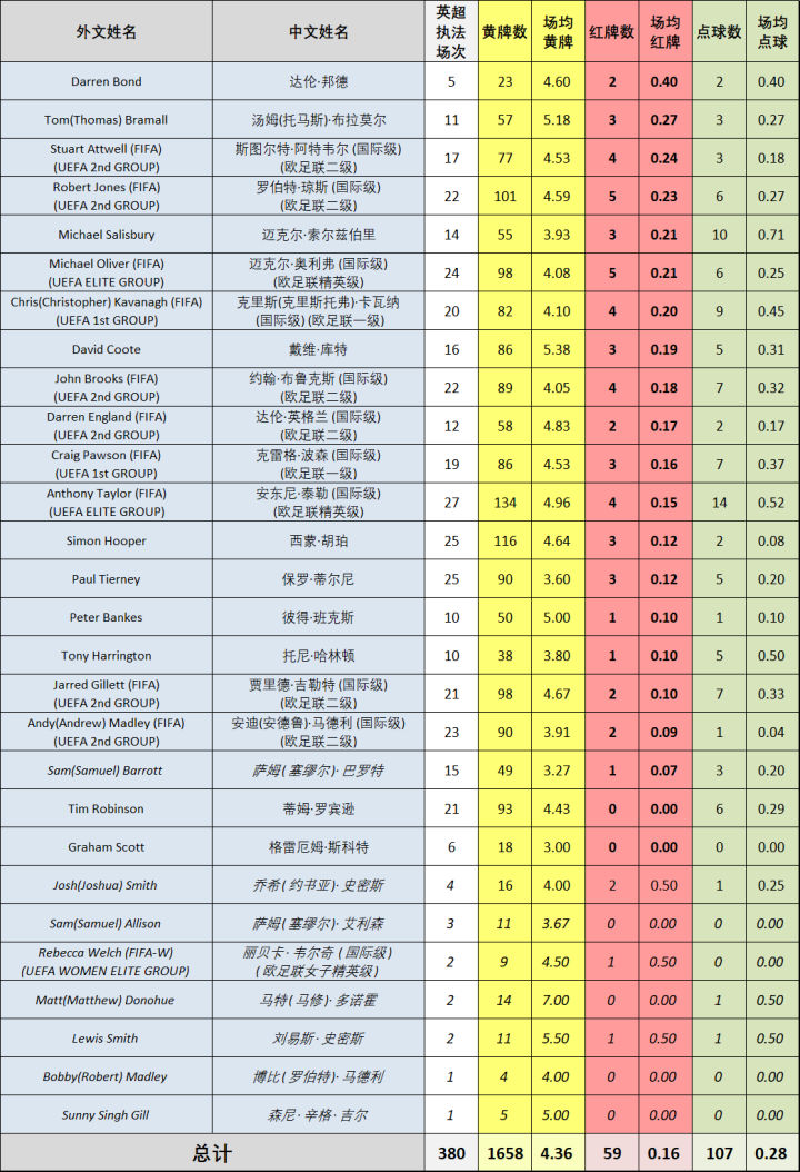 与之相反,场均红牌数最多的则是达伦·邦德。45岁的邦德从本赛季起才正式成为英超裁判员,却在赛季初受伤,直到足总杯正赛第2轮阶段才得以复出执法比赛,本赛季仅执哨了5场英超联赛,出示了2张红牌,场均红牌0.4张。