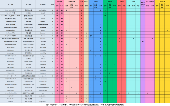本赛季共有33人在英超赛场担任了助理裁判员一职,其中包括30名英超助理裁判员以及3名英冠助理裁判员。其中,国际级助理裁判员西蒙·本内特的执法场次最多,达到了37场,此外还担任了10场AVAR。