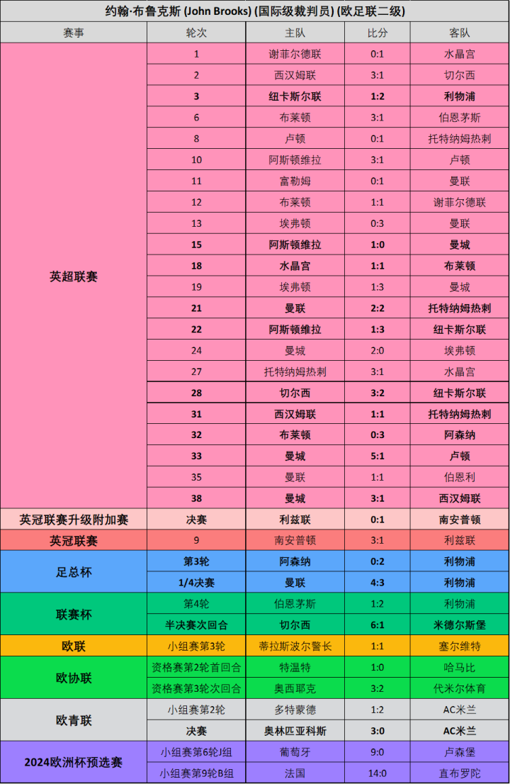 (图)23/24赛季布鲁克斯各项赛事执法场次明细