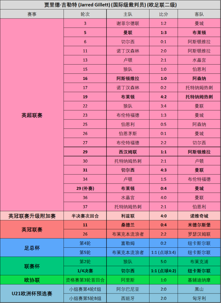 (图)23/24赛季吉勒特各项赛事执法场次明细