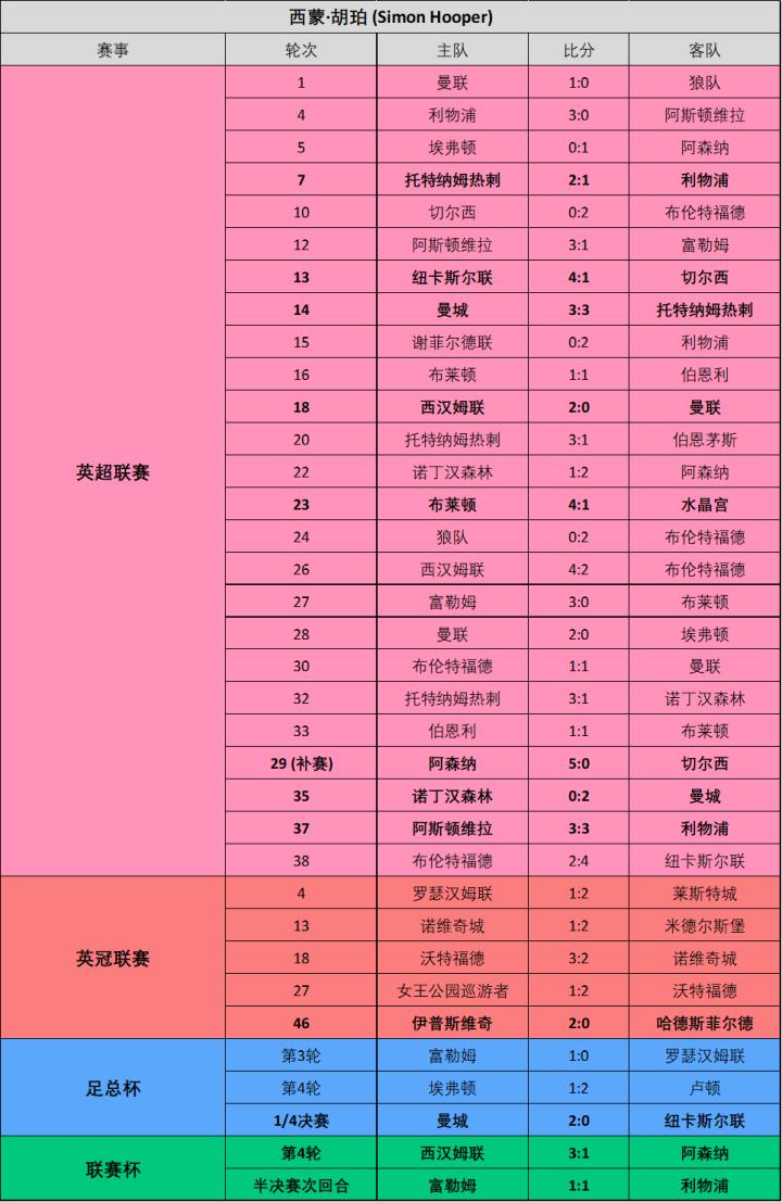 执哨7场英超比赛,其中3场赛后都登上头条,胡珀的执法水准饱受质疑。不过,PGMOL还是选择继续无条件信任胡珀,好在他下半赛季并未制造出大新闻,终于可以给不停道歉的韦伯一丝喘息的机会了。赛季末,胡珀还担任了足总杯决赛的第四官员。
