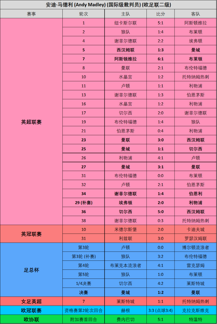 刚刚执法了本赛季足总杯决赛的安迪·马德利在欧洲赛场并没有这么高的待遇,他与达伦·英格兰类似,欧战都仅执哨了一场欧冠资格赛和一场欧协联附加赛,此后没能获得执哨小组赛的机会。