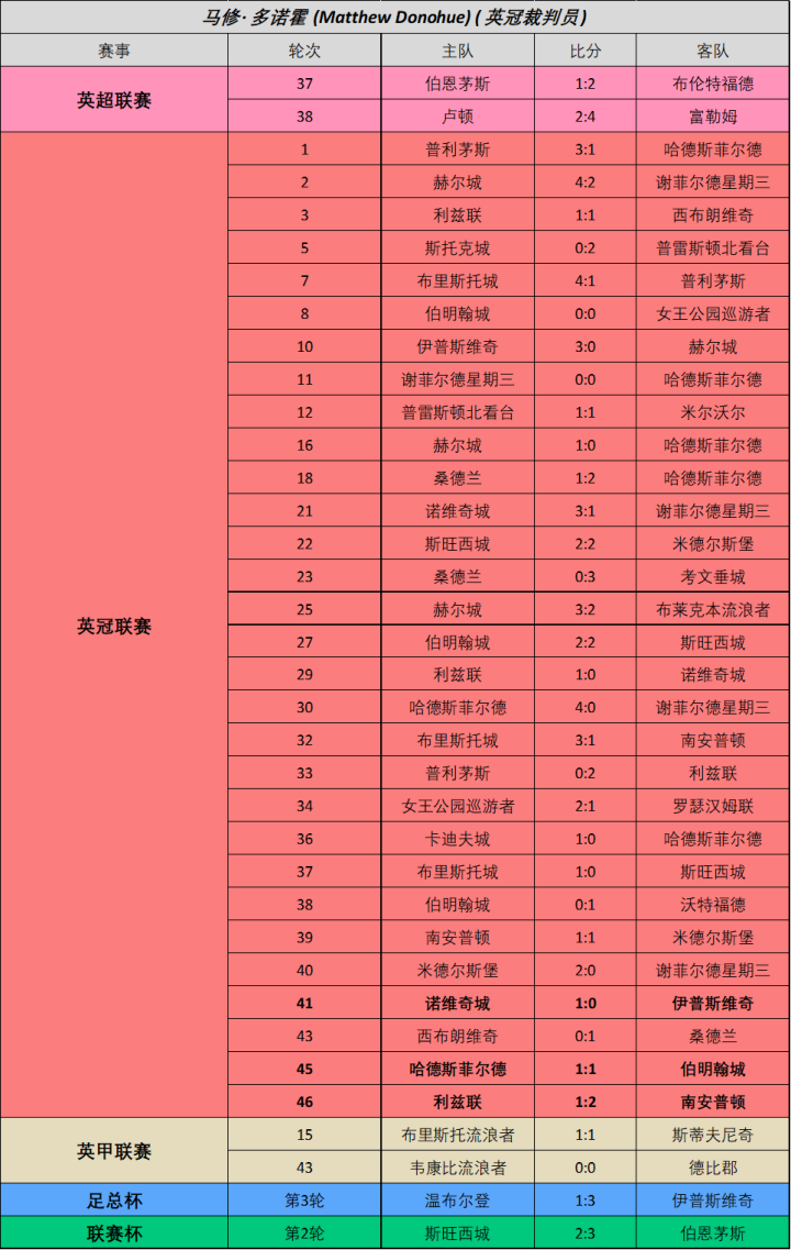 赛季末,另一名较为年轻的英冠裁判马特·多诺霍也获得了英超首秀机会,在第37轮和38轮连续执哨了2场英超联赛(伯恩茅斯1:2布伦特福德、卢顿2:4富勒姆)。不过,考虑到他在这两场比赛中的执法表现并不出色,VAR介入频率较高,新赛季晋升英超的可能性并不是很大。
