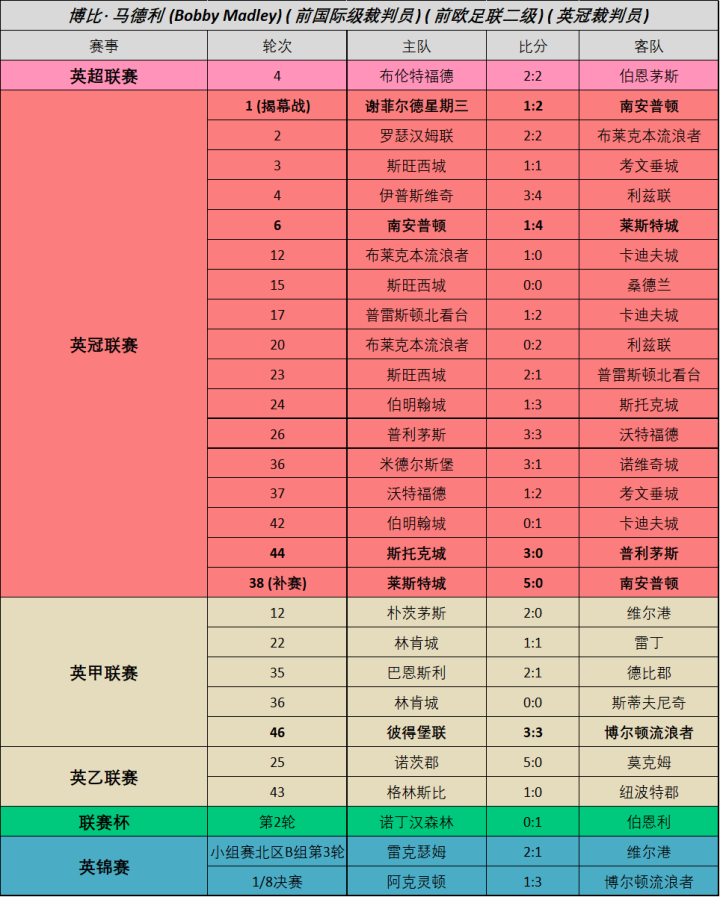 执法英超的英冠裁判员中有一个名字可能一些球迷还有印象——博比·马德利(以下简称“小马德利”)。目前38岁的小马德利曾是大英裁判的希望之星,早在13/14赛季(28岁)就成为了英超裁判员,并于2016年晋升国际级,曾执法15/16赛季英冠升级附加赛决赛以及2017社区盾杯等焦点大战,并担任了17/18赛季足总杯决赛第四官员,比他大两岁的亲哥哥安迪·马德利(本赛季足总杯决赛主裁)当年还只是英冠裁判员。