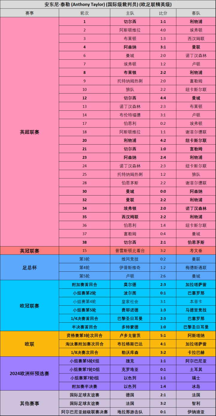 (图)23/24赛季安东尼·泰勒各项赛事执法场次明细