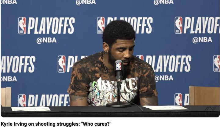 2019年东部半决赛,凯尔特人以联盟四号种子身份对阵雄鹿。欧文在整个系列赛中表现非常糟糕,104投37中,三分球32投7中。当被问及是否经历过如此严重的投篮低迷时,欧文满不在乎地说:"谁在乎呢?",他还自信地表示:“人们对我期望很高,我会利用进攻寻找机会,同时让队友处于有利位置。我试图做到这一切,所以对我来说,22次出手,你知道,我应该投30次,我是非常出色的射手。"