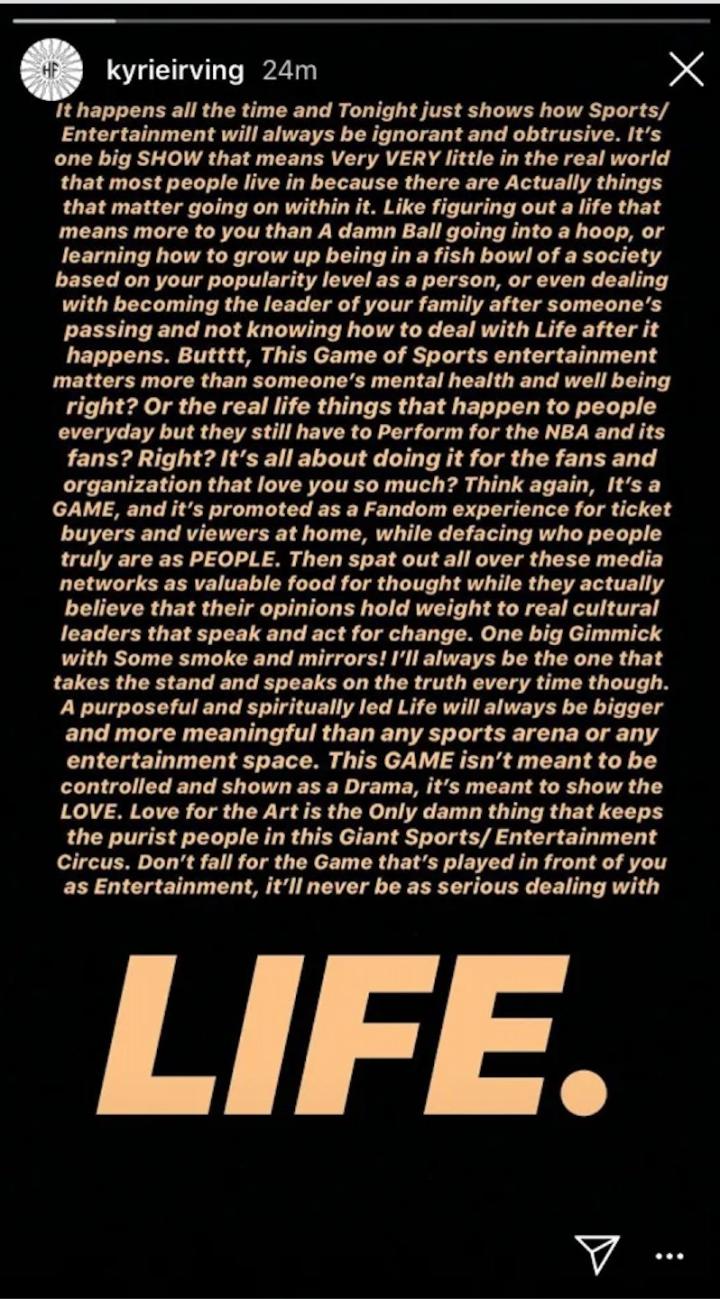 2019年11月,已经去了篮网的欧文重新回到了凯尔特人主场,尽管他因伤缺阵,但这并没阻止球迷对他的嘘声。赛后,欧文在社媒上发了一篇长文斥责凯尔特人球迷,称他们"无知又无礼"。
