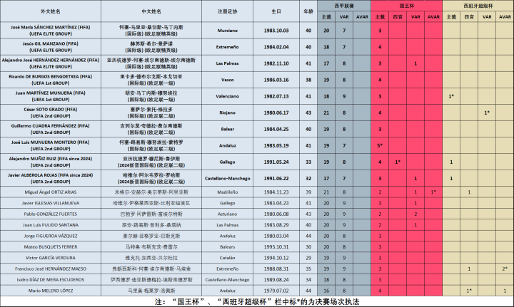 除了三名欧足联精英级以及两名欧足联一级,来自西班牙的其余五名国际级裁判员都在欧足联二级裁判的序列中,分别是40岁的吉列尔莫·夸德拉、41岁的何塞·穆努埃拉、43岁的塞萨尔·索托、33岁的亚历杭德罗·穆尼斯以及32岁的哈维尔·阿尔韦罗拉,其中后两位是2024年新晋国际级裁判员。