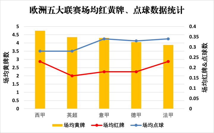 在欧洲五大联赛中,西甲裁判本赛季的场均红黄牌数虽有所减少,但依然毫无意外地排名第一,场均点球数则排在末位。