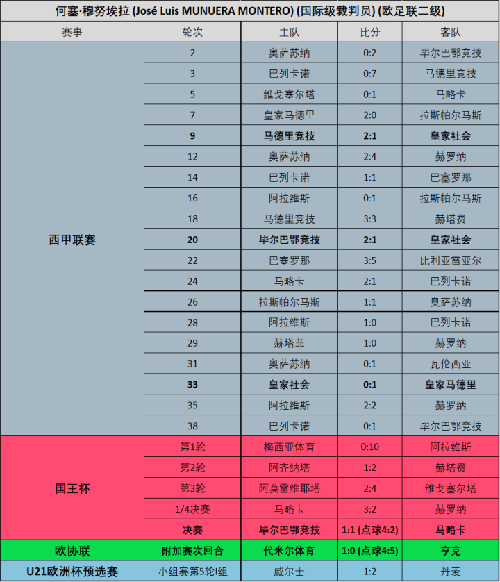 此前一度被称为“西班牙最菜国际级”的何塞·穆努埃拉虽然近两个赛季以来的执法状态和表现都有所改善,本赛季还执法了马竞2:1皇家社会以及最终的国王杯决赛等焦点战,但他显然还没能打动欧足联。