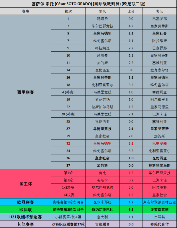 然而,考虑到他即将44岁的年龄情况,欧足联显然不想将重心放在这样一位即将退出国际级的高龄裁判身上,本赛季仅委派索托执法了一场欧冠资格赛、一场欧协联资格赛以及一场U21欧预赛,索托无疑将以欧足联二级裁判的身份在未来一至两年内取消国际裁判员的报名。