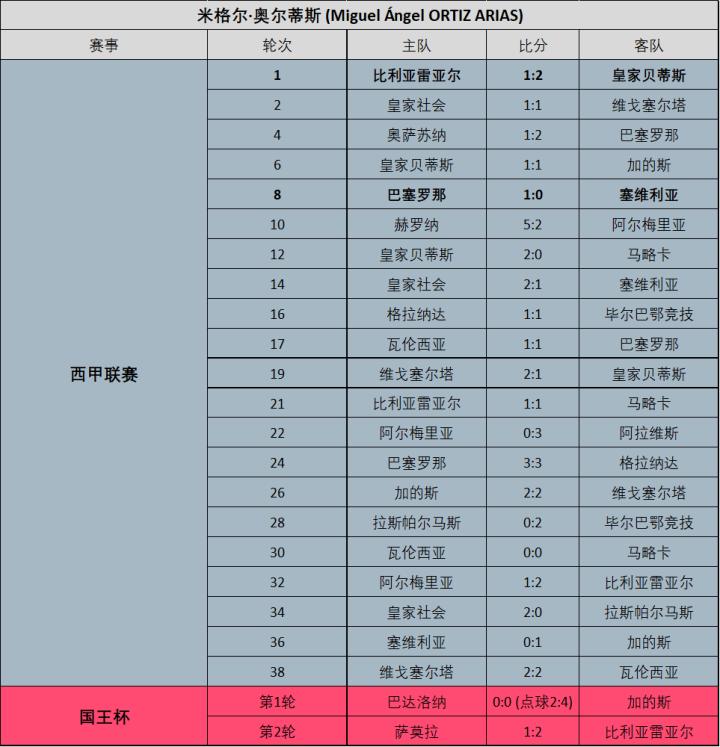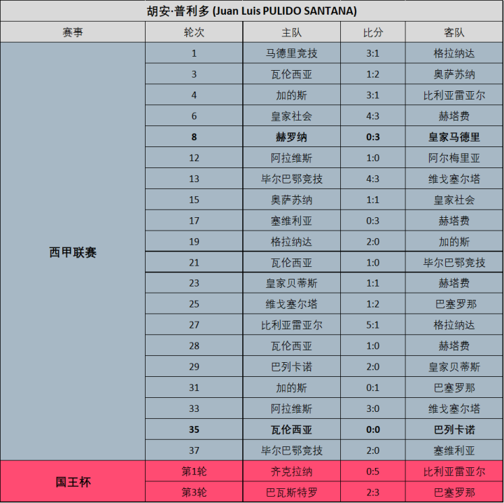 通常情况下,每位西甲裁判员单赛季担任主裁的场次应该是19场,而本赛季执哨场次最多的达到了21场,分别是塞萨尔·索托以及米格尔·奥尔蒂斯,执哨场次最少的则是马里奥·梅莱罗,仅有16场。