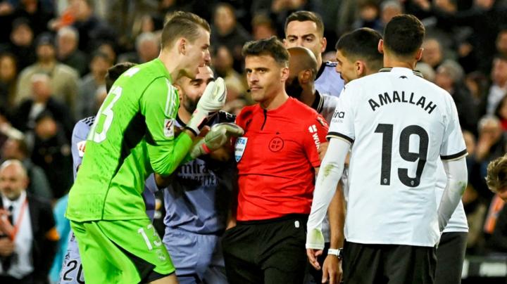 本赛季西甲赛场,最出名的、影响力最大的争议判罚无疑来自于现役“首席裁判员”——赫苏斯·希尔-曼萨诺。在第27轮瓦伦西亚与皇家马德里的比赛进行到下半场伤停补时第8分40秒时,皇马右路起球传中,随后当值主裁希尔立即吹响了终场哨,哨响之后贝林厄姆头球破门,但这并不能被视为进球。