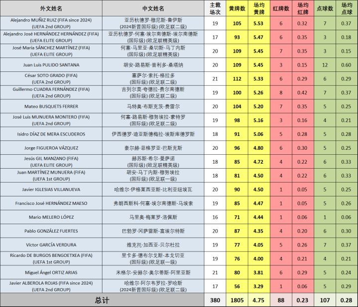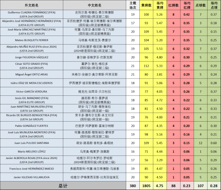 在控制住各自的“发牌欲”后,本赛季甚至没有任何一名西甲裁判员的场均黄牌数大于6张,这是近年来很少见到的情况,场均黄牌数最高的裁判员不过也就5.53张(亚历杭德罗·穆尼斯),而“板鸭第一发牌机”埃尔南德斯“平方”只能以场均5.47张黄牌的战绩屈居黄牌榜第二,这是他执法西甲多年来为数不多的场均黄牌数在6张以下的赛季,总黄牌数居然还没破百。