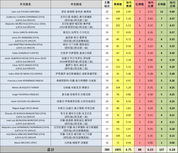 本赛季西甲赛场380场比赛共计出现了1805张黄牌、88张红牌以及107粒点球,场均黄牌4.75张、红牌0.23张、点球0.28粒。与上赛季相比,西甲裁判中的各位“卡牌大师”在本赛季的执法尺度有着极为明显的“收敛”,场均黄牌数同比减少5.6%,场均红牌数同比减少38%。(上赛季西甲联赛场均黄牌5.03张、红牌0.37张、点球0.25粒)