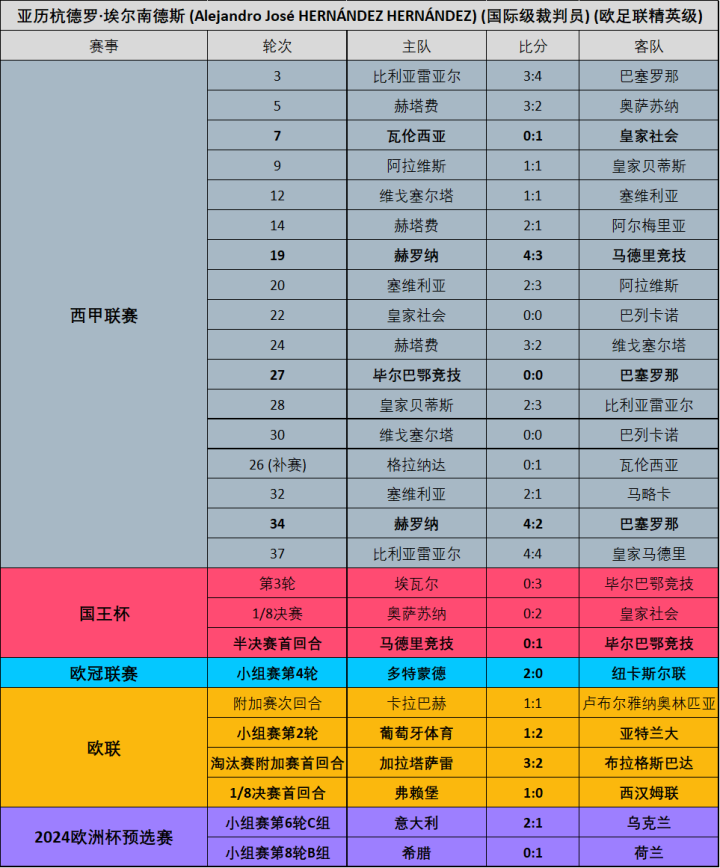 (图)23/24赛季埃尔南德斯各项赛事执法场次明细