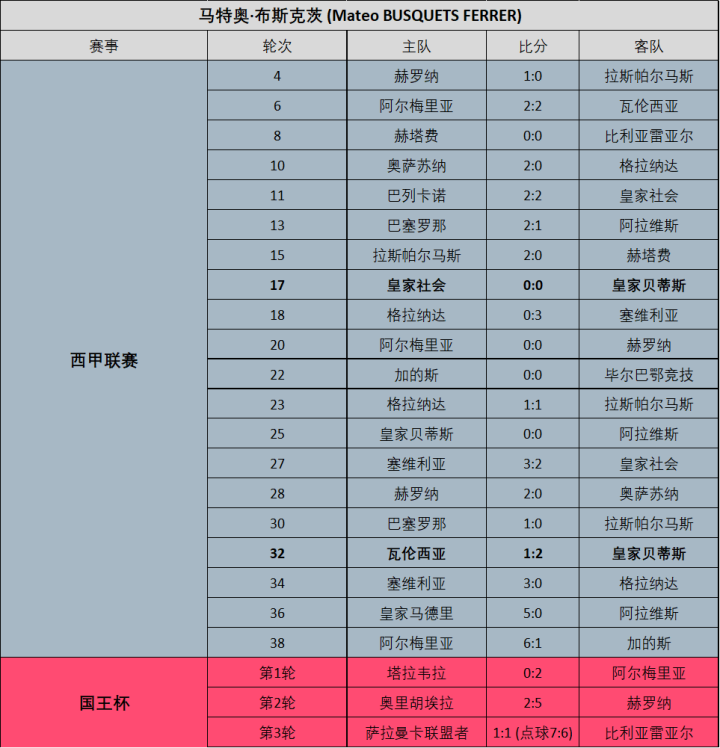 上赛季结束后,马特奥·布斯克茨、弗朗西斯科·埃尔南德斯以及维克托·加西亚这三名西乙裁判员同时晋升至西甲联赛,其中年仅30岁的布斯克茨本赛季的执法表现给人眼前一亮的感觉,他也迅速收获了西足协的认可,执哨了西甲第17轮皇家社会0:0皇家贝蒂斯以及包括巴萨和皇马等强队在内的多场焦点战。未来,年轻的布斯克茨势必将成为国际级名额的最有力争夺者。