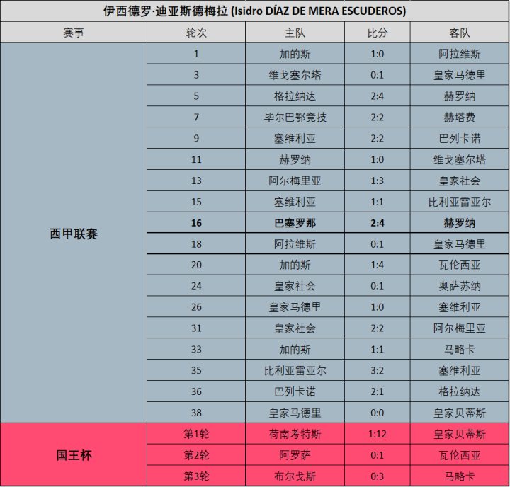即将年满45岁的马里奥·梅莱罗受伤病影响,本赛季仅执法了16场西甲联赛,且发挥不佳。其实不仅是本赛季,梅莱罗在此前已经连续多个赛季没能拿出令人信服的表现了。第38轮,梅莱罗执哨了奥萨苏纳0:0比利亚雷亚尔的比赛,很可能会就此退役。